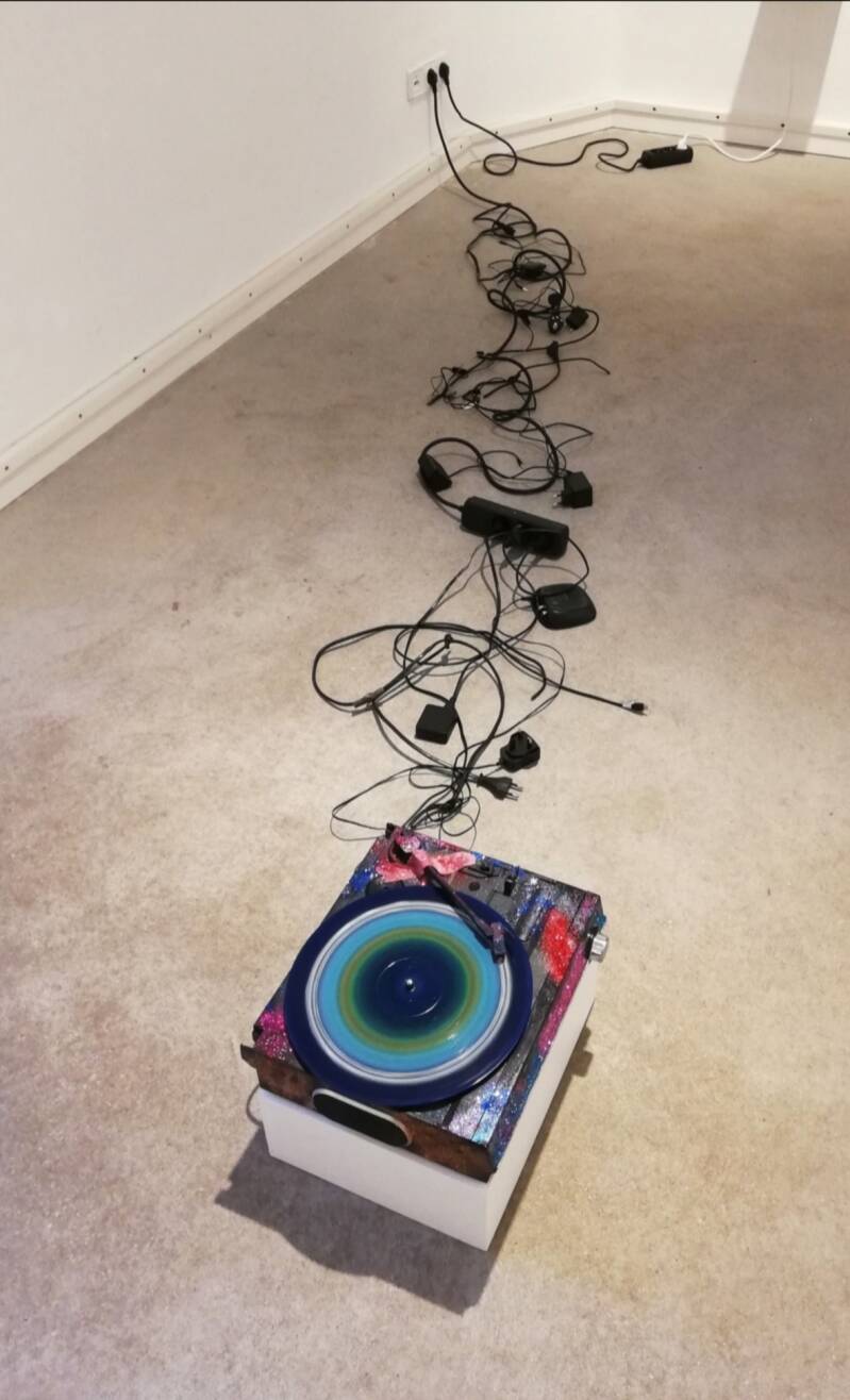 "Memorial Days: 9.2. Safer Internet Day", 2021, sound object, Record player with many cables, painted record by Carlos Silva, Berlin, ca. 300 x 40 x 30 cm