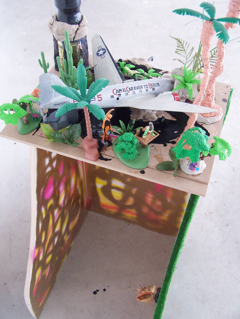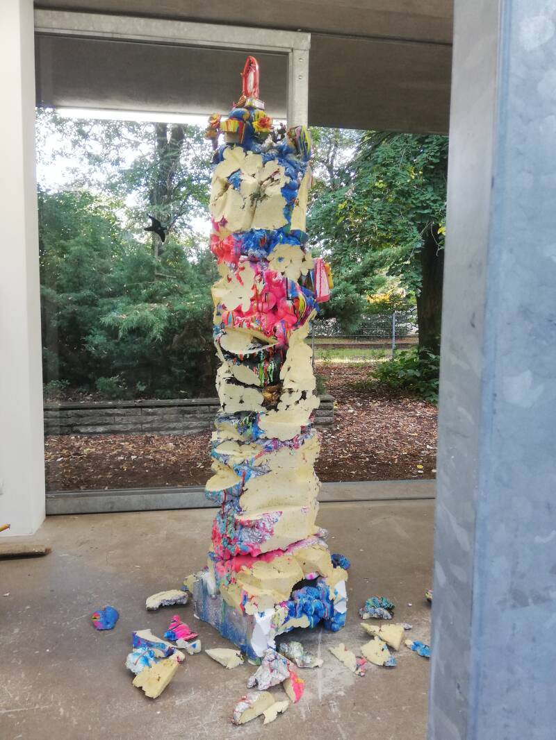 "Deconstruction", 2000/2020, styrofoam, toys, color, Performance with a saw, about 2m high