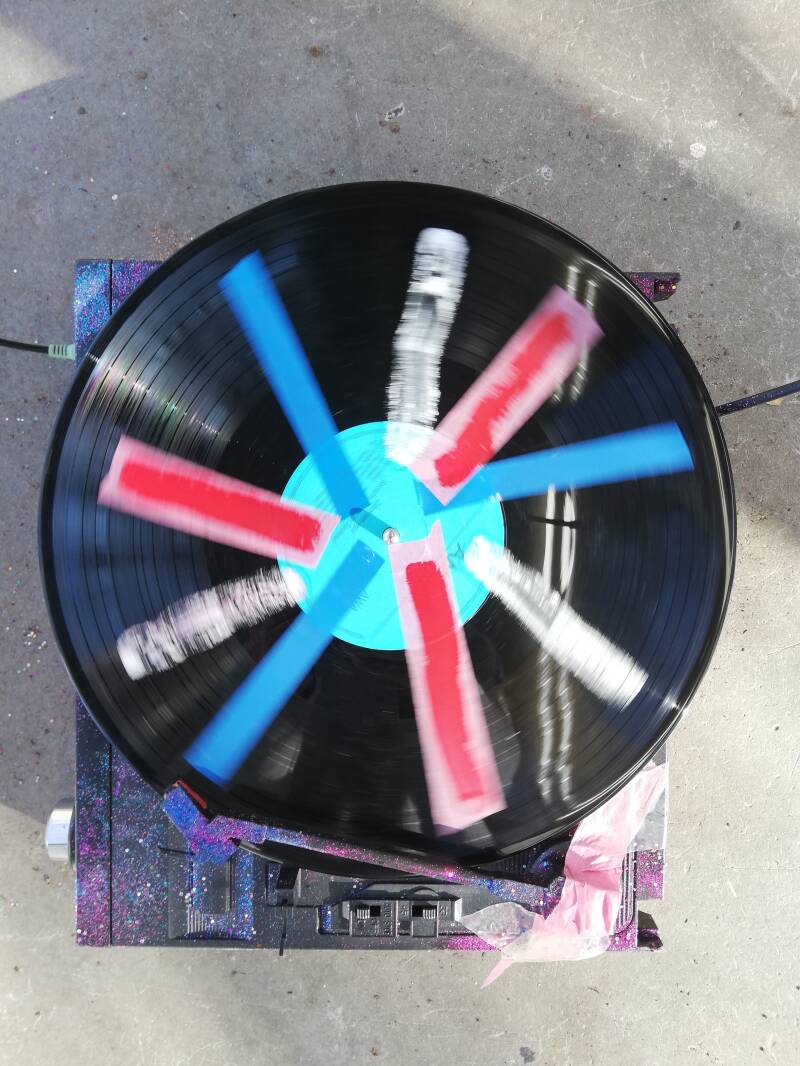 "Memorial Days: May, 8th: Day of liberation from National Socialism and the end of the Second World War in Europe", 2025, sound object, Record player with many cables, painted record