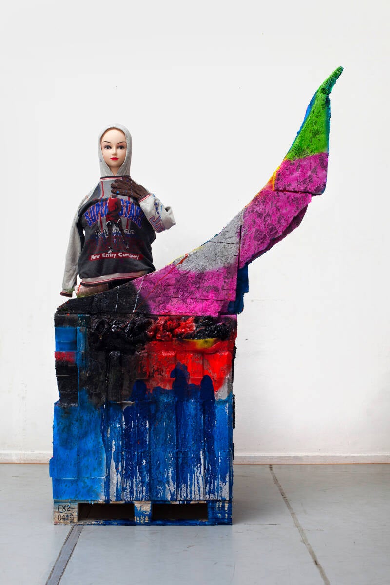 "Simply great", 2014, Doll on styrofoam, cement, color, wood, 203 x 125 x 53 cm